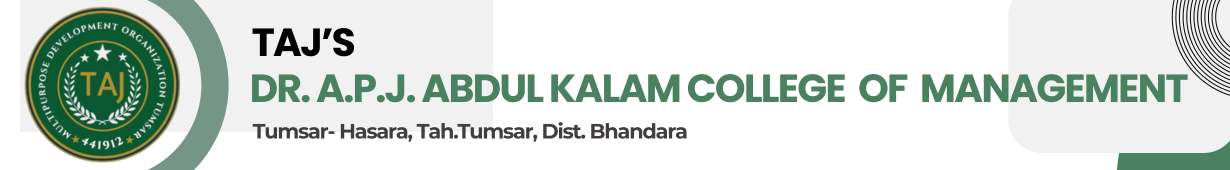 Welcome to Dr. A.P.J. Abdul Kalam College of Management, Tumsar Taj Multipurpose Development Organization, a pioneering institution in the field of education, has consistently worked towards empowering communities through knowledge and skill development. Over the decades, the organization has earned immense recognition for its commitment to academic excellence, value-based education, and social development initiatives. From humble beginnings, it has grown into a reputed educational body that continues to shape the future of thousands of students. Driven by a vision to make quality education accessible to all, Taj Multipurpose Development Organization has established a strong network of schools and colleges that focus on holistic learning. Each institution under its umbrella is guided by experienced educators, visionary leaders, and a team of dedicated professionals who believe in nurturing young minds to become responsible, self-reliant, and socially conscious citizens. Dr. A.P.J. Abdul Kalam College of Management, Tumsar, stands as a proud extension of this vision. Named after one of India’s most respected scientists and former President, Dr. A.P.J. Abdul Kalam, the college embodies his ideals of knowledge, innovation, and integrity. The institution is committed to offering a dynamic learning environment for students pursuing commerce, science, management, and related fields. Located in the educationally growing region of Tumsar, the college provides students with excellent infrastructure, well-equipped classrooms, modern teaching facilities, and a peaceful environment ideal for focused learning. Special emphasis is placed on developing both academic knowledge and practical skills through workshops, seminars, research initiatives, and industry exposure. The college’s leadership, under the guidance of Taj Multipurpose Development Organization, strives to create opportunities that go beyond traditional education. The aim is to prepare students for future challenges by instilling leadership qualities, critical thinking abilities, and professional ethics. With a clear mission to become one of the most reputed colleges in the region, Dr. A.P.J. Abdul Kalam College of Management envisions contributing significantly to the educational and socio-economic growth of Tumsar and nearby areas. By blending modern education techniques with strong values, the college seeks to shape future leaders who will drive positive change in society.
